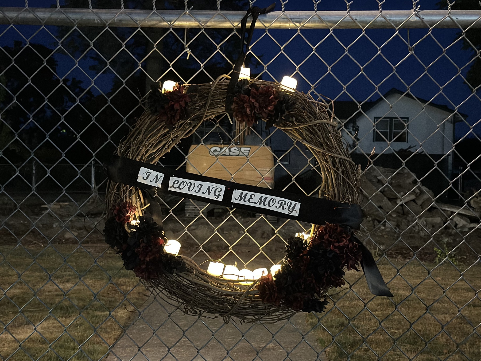 Photo at top of page: A memorial wreath laid upon the fence in front of the demolished Ryan House. Photo courtesy of Feliks Banel.
