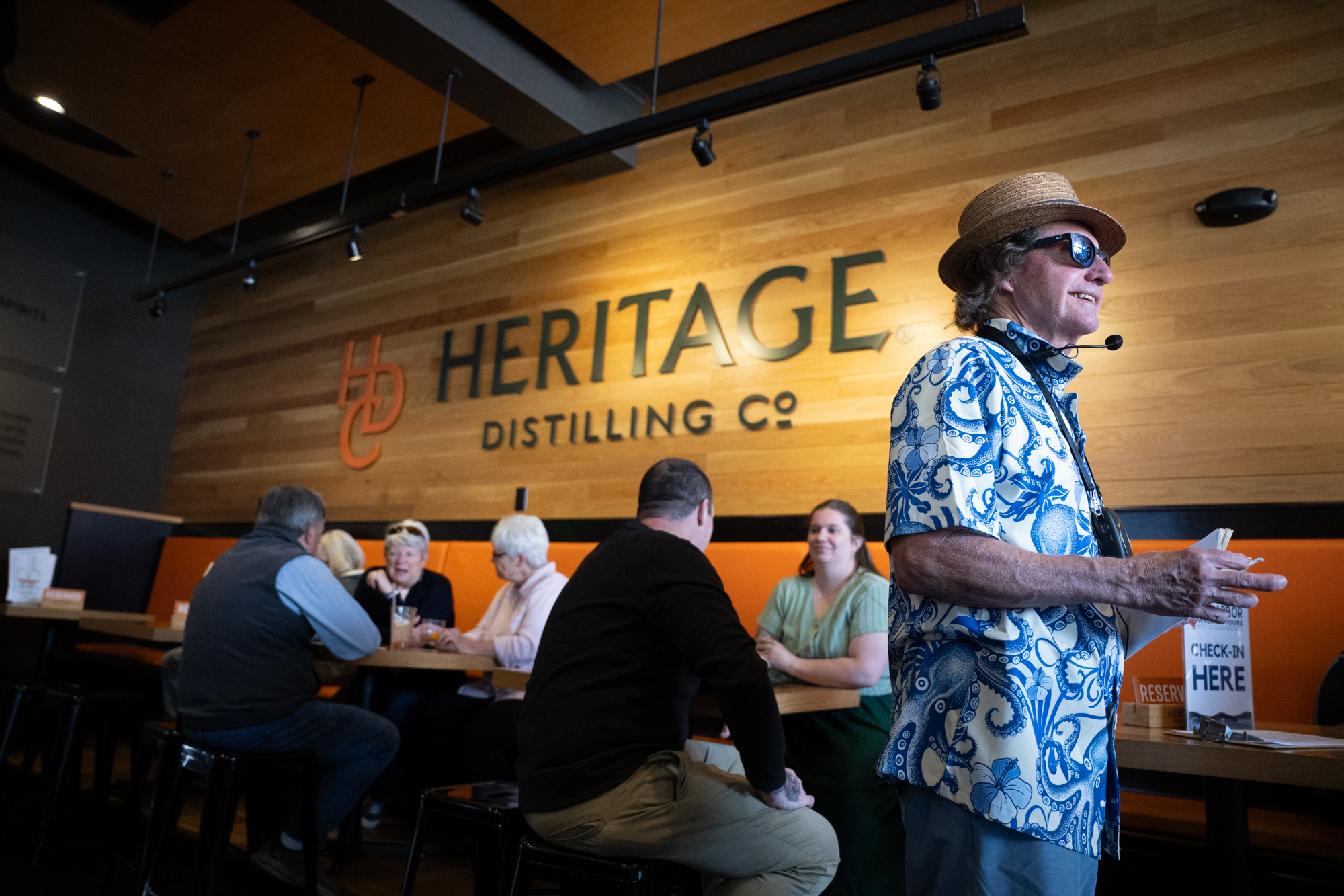 A local walking tour pops in to explore Heritage Distilling downtown.