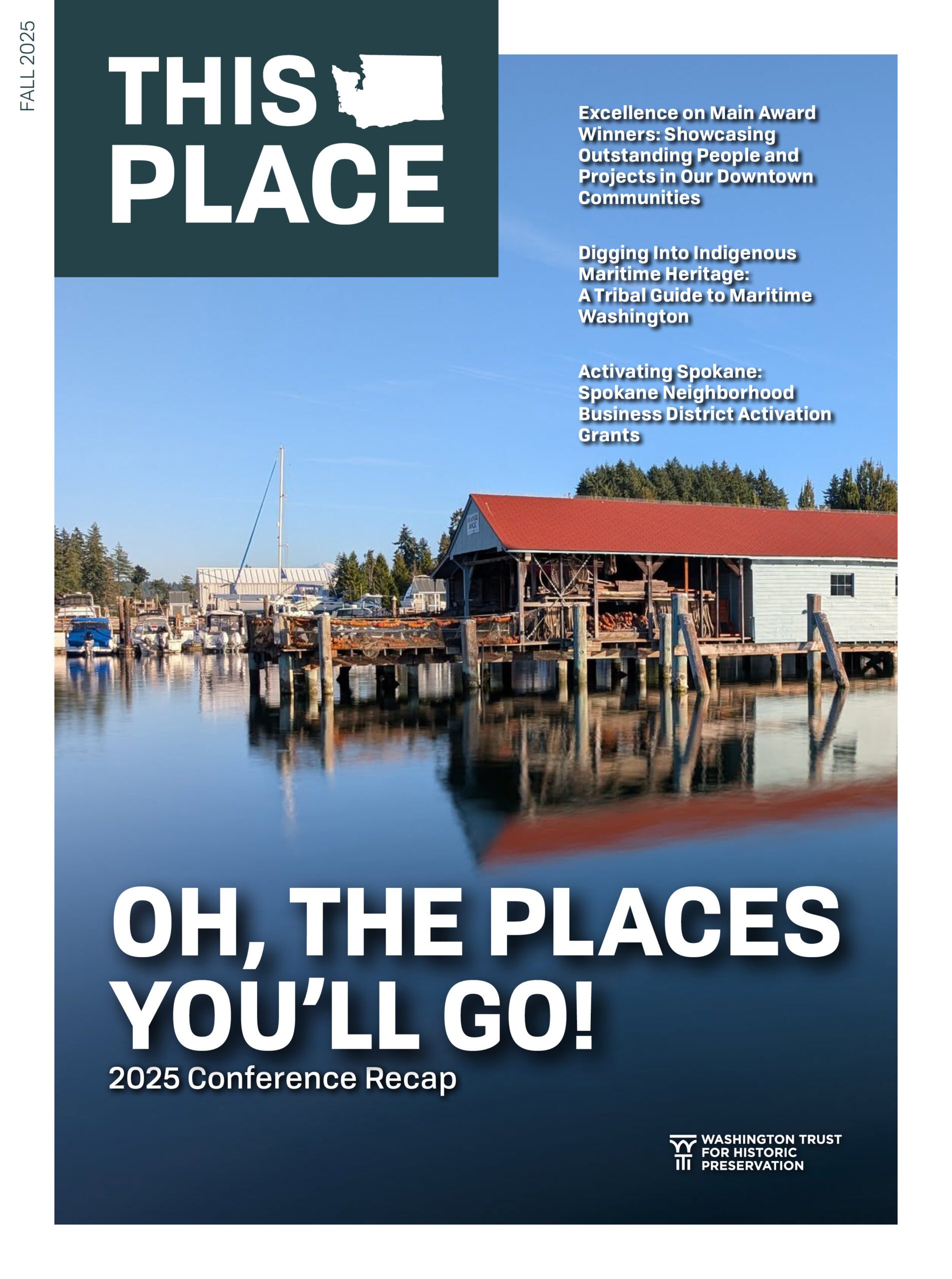 We’re sad to announce that, due to budget constraints and rising costs, the Fall 2025 issue will unfortunately be the last for our printed quarterly magazine, This Place. But fear not! We’re working to transition much of the magazine’s recurring content to ongoing news posts on our website. Stay tuned to preservewa.org (and our social media channels @preservewa) for new original content, policy and advocacy updates, Main Street and preservation case studies, and much, much more. We hope you’ll also continue to contribute to the Washington Trust through your donations and memberships. Your support is needed now more than ever!