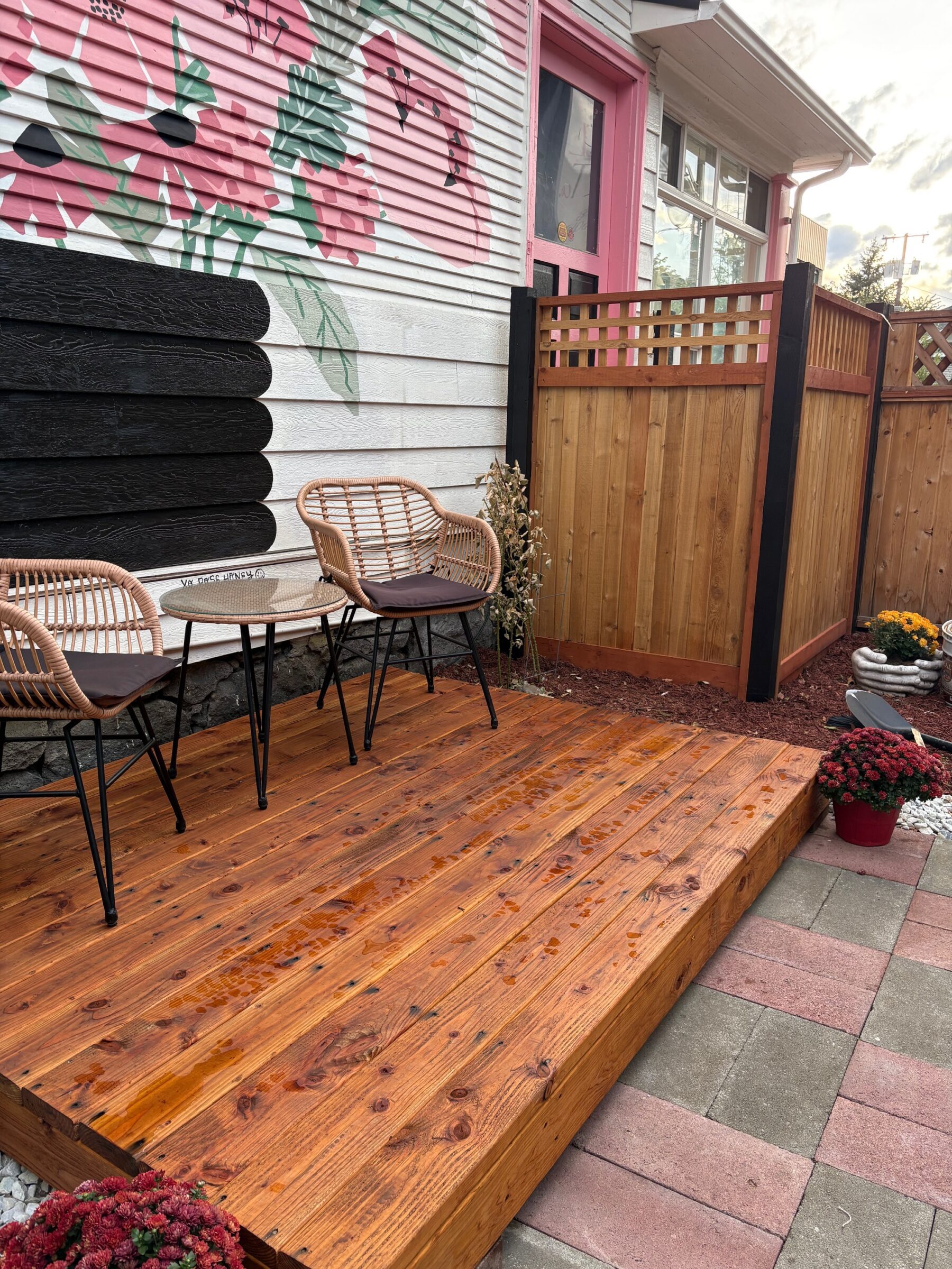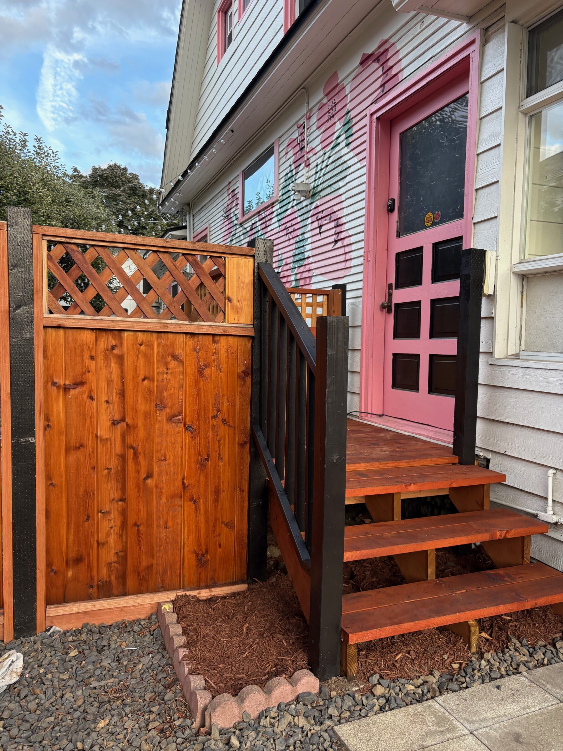 The project, completed with the help of activation grant funds, transformed the exterior of the Garden Gate property in the heart of the North Monroe Business District. The improvements included beautification efforts such as planting vibrant perennials and annuals, adding white rock trim, and installing new planters to create a welcoming and intentional design. Furthermore, the project addressed safety and aesthetics by rebuilding the deck and stair access to the upstairs apartment and staining and replacing sections of the existing fence. For the new small business, the grant’s impact is already visible: the upgrades have significantly enhanced the building’s curb appeal, making the space feel more inviting for neighbors and visitors and strengthening its potential as an attractive location for local business activity and community gathering, thereby contributing to the overall revitalization of Monroe Street.